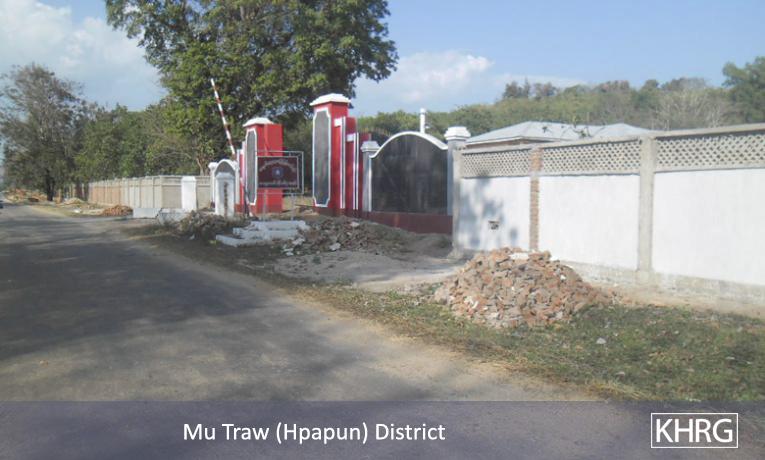 This photo was taken by a KHRG community member in November 2013 in Bu Tho Township, Hpapun District. This photo shows Tatmadaw Light Infantry Battalion (LIB) #434’s army base, situated in between Way Hsah and T’Koh Teh villages. According to the KHRG community member, this army base was originally fenced with bamboo and barbed-wire, but in the beginning of 2013, the camp was strengthened and fenced with bricks and cement. [Photo: KHRG]