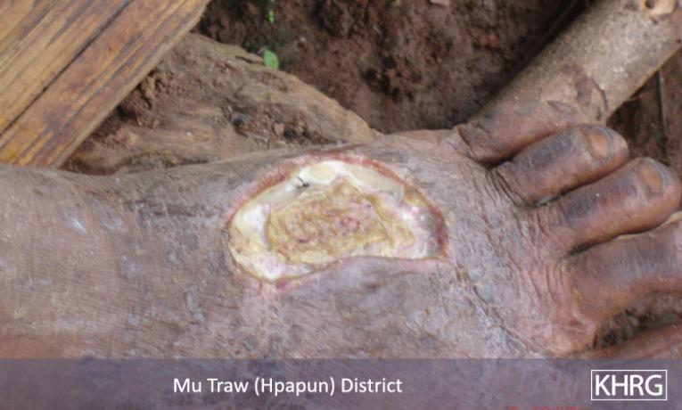 Two escaped porters in Papun District display wounds caused by the constant friction and pressure of the bamboo baskets they had to carry on their backs. [Photo: KHRG] A festering wound on the left foot of a convict porter caused by the wear of his rubber sandals. SPDC soldiers and medics provide no treatment to wounded porters and forbid them from resting to recover from such injuries. [Photo: KHRG] A festering wound on the left foot of a convict porter caused by the wear of his rubber sandals. SPDC soldiers and medics provide no treatment to wounded porters and forbid them from resting to recover from such injuries. [Photo: KHRG]