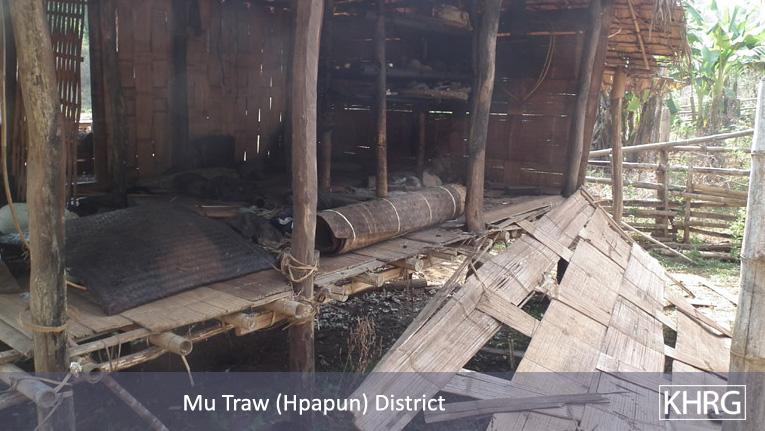 In February 25th 2011, villagers from a total of 14 villages in Saw Muh Bplaw, Ler Muh Bplaw and Plah Koh village tracts in Lu Thaw Township, Papun District, temporarily fled shelling by a column of soldiers from Tatmadaw Light Infantry Battalion (LIB) #252, according to local sources that spoke with KHRG.[1] One source also reported that Tatmadaw soldiers fired small arms at civilian residences during the attacks, which KHRG confirmed with photographic evidence. Following sustained mortar fire, Tatmadaw troops entered Dteh Neh village in Saw Muh Bplaw village tract after residents had fled, and burned down at least one house and two rice barns, stole villagers' animals, destroyed agricultural equipment, poured out stores of paddy grain, and ransacked and dismantled five houses.