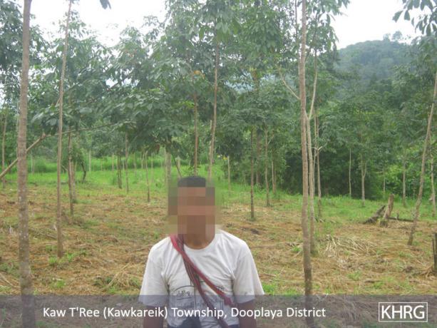 These photos, taken on September 30th 2011, show 48-year-old Saw C--- and parts of his 20-acre rubber plantation in the Mi--- area of Je--- village, Kawkareik Township. Saw C---’s plantation has approximately 4,500 rubber trees which he planted four years ago; his plantation is among lands that Je--- villagers worry will be confiscated by the Tatmadaw after the 2011 monsoon ends. [Photos: KHRG]