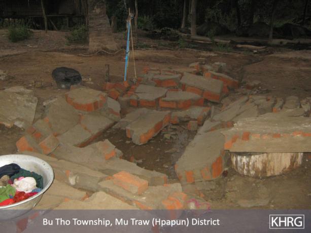 These photos, taken on February 11th 2012, show C--- villagers near a hydroelectric-powered well, top, built as part of a government development project and the broken cement, middle, after the well collapsed on February 12th 2011. A 12-year-old-girl retrieving water from the well was injured on her leg when the bricks collapsed. [Photos: KHRG]