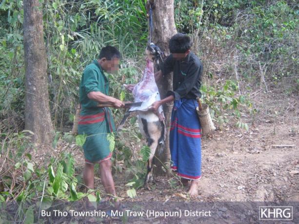 These photos, taken on February 11th 2012, show C--- villagers preparing one goat, left, and one pig, right, for Burma government members from Papun District when they visited to set up a hydroelectric energy source in C--- village, Papun District. [Photos: KHRG]
