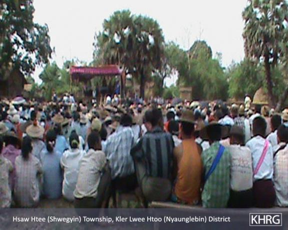 On March 12th 2012, over 400 villagers from A---, M---, H---, T--- and N--- villages gathered together and protested Kyauk N'Ga Dam on the Shwegyin River in N--- area, Hsaw Htee Township and Ler Doh Township, Nyaunglebin District. There were three slogans that the villagers called out: