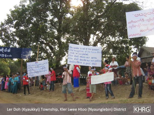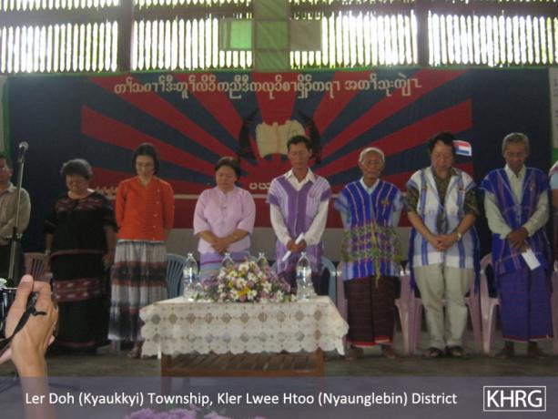 Nine people, including a KNU secretary and representatives, came to Ler Doh and opened a KNU liaison office in Ler Doh town on April 9th 2012. The KNU and the government leader, U Aung Min, came and opened a temporary KNU liaison office inside the USDP [Union Solidarity and Development Party] office. The villagers awaited the KNU and the government leaders to come, this time, with willingness and need for real democracy. The villagers waited for the leader's representatives along the way from Na Tha Kway to Ler Doh; there were over ten thousand people. In the past, battles always occurred in the area and the villagers were always depressed. So, the villagers need freedom, and they reported their needs and opinions for the opening of the liaison office to the leaders from both sides, advocating for a real need for democracy. While the villagers waited for the leaders from both sides, they made a sign that said: "We pray to be liberated from battles in Ler Doh area". The villagers' sign showed their real need and desire to be liberated from fighting, pressure and conflict. The leaders from both sides will arrange and settle the conflict to create real democracy that will be stable forever.