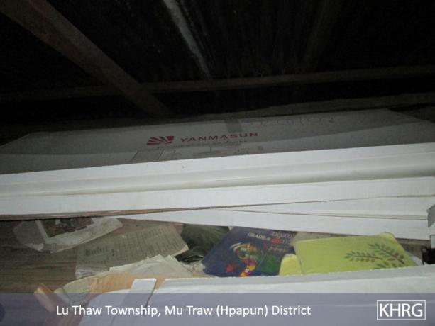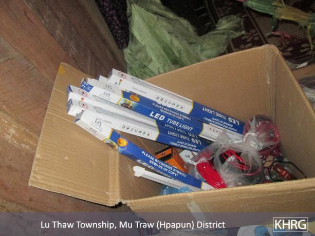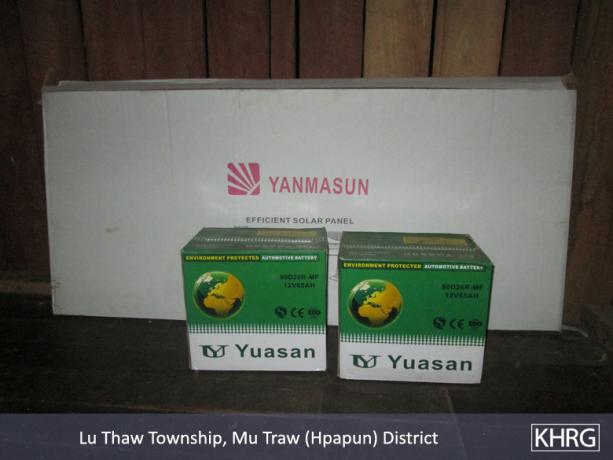 The above photos were taken on April 4th 2015 in U--- area of Hpapun Town, at Uu--- village head’s house. They show the solar panels, batteries, tube lights and wires which were provided by Burma/Myanmar government to the villagers in F---, Nn---, Oo---, and Y--- villages. The villagers went to collect 40 solar panels [from Hpapun town] and brought them back with motor boats. The KNU heard the information and they told villagers, “none of you were allowed to take. You have to send them all back directly to Hpapun Town.” Therefore the villagers responded to them, “we will not send the aid back because we already brought it to our villages.” and so they did not dare to send it back. [The villagers told them,] “If you do not allow us to take, you have to send it back by yourself [KNU]”. Later Saw Pp--- himself went to send it back. They [he] went to keep it in Uu--- at the village head’s house and other peoples’ houses. The solar panels did not reach the government office. Also some of them were lost along the way. After they kept it there, some of them [villagers] went to take it secretly. They said, “if other people ask about it, we will tell them we bought it ourselves.” I received the information from Uu--- village head and some of villagers also told me. [Photo: KHRG]