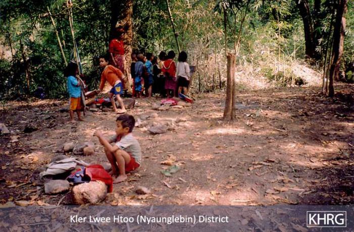 “Because the SPDC [Tatmadaw] is active near my neighbours’ village, we have had to flee from our village. The school year is not finished yet so the children have had to continue their schooling under the trees in the   jungle.” Saw L--- (male, 59), L---village, Lu Thaw Township, Hpapun District/ northeastern Kayin State (interviewed in January 2007)[42]
