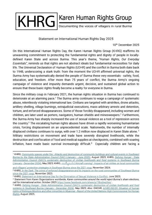 This Situation Update describes events occurring in Kruh Tuh Township, Dooplaya District, in April 2025, including shelling and air strikes, displacement, and challenges in accessing healthcare and education. On April 14th 2025, fighting broke out between the State Administration Council (SAC) troops and armed resistance groups along the Asian Highway, between Kaw T’Ree and Kruh Tuh towns. Following the fighting, the SAC conducted air strikes and shelling into Aa--- village, Kaw Wa Hlaing village tract, damaging two monastery buildings, two houses, and one car on an unknown date. On April 15th 2025, SAC air strikes and shelling in Myauk Kya...