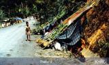 Photos #108-11: Newly-arrived Karen refugees camped along the roadsides and in the drainage gutters at Ka Hee Pa Leh in Thailand in mid-February. About 6,000 new refugees were camped along the road. Thai authorities would not let them build shelters away from the dusty, heavily-trafficked road, and would not let them move into the new refugee camp at Nu Po until a month later. [Photos: KHRG]