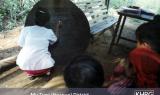 Photo #E124: Naw D---, 10 years old, and her sister Naw S---, 7 years old, pound rice under their house in the xxxx hiding site in northern Papun District. Both of the girls go to school during the day but they must pound paddy afterwards so their family can eat in the evening. SPDC activity in the area has made it difficult for villagers in the area to work their fields and find enough food to eat. Their father has gone to find paddy in another place and their mother must go to weed their small field leaving the children to take care of chores around the house like pounding the paddy. Sometimes these children do not have enough food to eat when they go to school. [Photo: KHRG researcher]