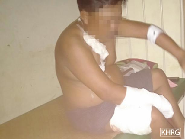 This photo was taken on September 11th 2020 at 8:29 pm at the Hpapun hospital, Mu Traw District. It shows the injuries sustained by E--- after the UXO explosion. [Photo: KHRG]