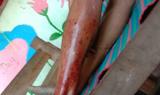 The three photos were taken on October 20th 2022 and show the injuries sustained by Ak--- from a tripwire landmine explosion in Al--- village, Maung Khee village tract, Kaw T’Ree (Kawkareik) Township, earlier that day. The first two photos show the injuries to his left ear and left leg, and the last photo below shows the injuries he sustained on his back. The tripwire landmine was assumed by villagers to have been set up by SAC military based at the Aung May K’Lar military camp. This incident occurred when Ak--- went to make charcoal beside the military camp, as he was returning to his kiln with wood he had collected in the forest close to the camp. He was sent to Waw Lay Hospital in Waw Lay Town, Kaw T’Ree Township, where he stayed for four days of treatment.[24] [Photos: Local villager]