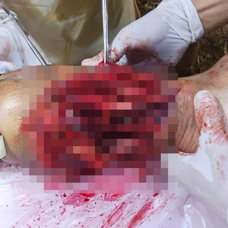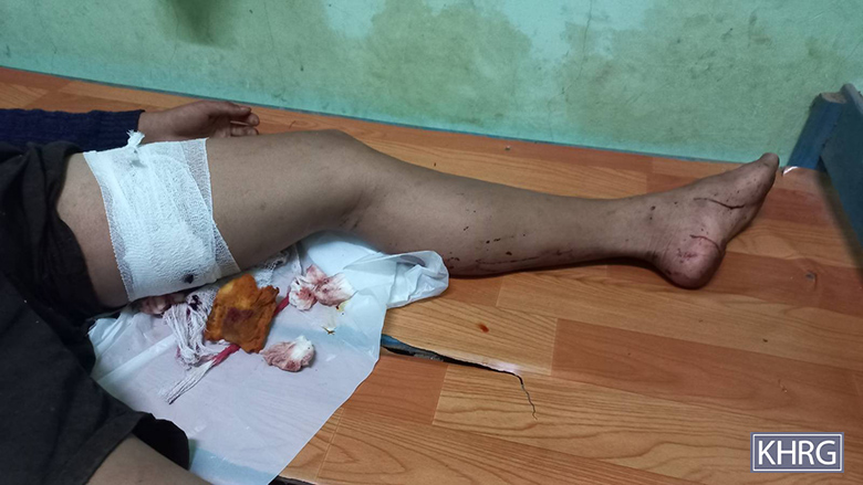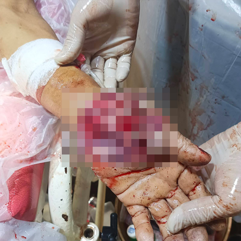 These two photos were taken in May 2024, in a local clinic in Kyaw Pya village tract, Kyeh Htoh Township, Doo Tha Htoo District. On May 6th 2024, starting at 4:20 am, SAC Artillery Unit #310, based in Thein Za Yat Town, Kyeh Htoh Township, fired three Howitzer shells and one shell landed into a rubber plantation in Ac--- village, See Pyaw village tract, and exploded, injuring a villager named Saw J--- (45 years old), from Af--- village, Pyin K’Done village tract. The photo on the left shows the injury to Saw J---’s calf, and the photo on the right shows the injury on his hand. The villager died in the clinic where he was receiving treatment due to the severity of his wounds. [Photos: Local villager]