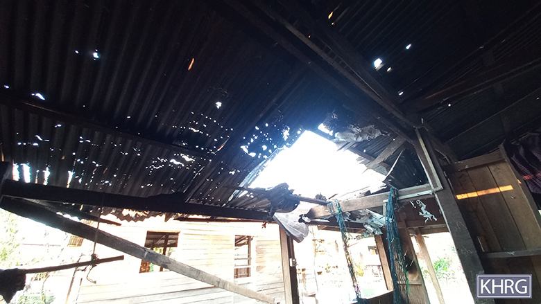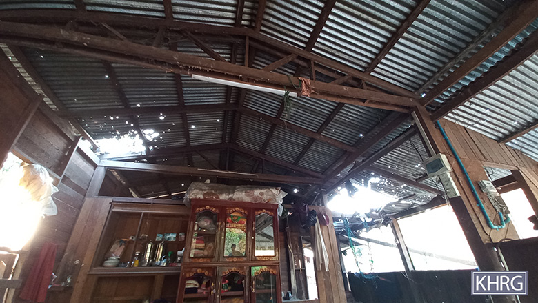 These two photos were taken in March 2024, in Ab--- village, Hk’Rweh village tract, Kyeh Htoh Township, Doo Tha Htoo District. On February 17th 2024, at around 12 am, SAC soldiers based in Ad--- village, Waw Township, Bago Division, conducted a drone strike into Ab--- village, Hk’Rweh village tract, and two bombs landed on the house of a villager named Daw D---. The shrapnel from the explosion damaged her house and injured her daughter, Ma E--- (18 years old), on her head and chin. These two photos show the house, which was damaged by the SAC drone strike. [Photos: KHRG]
