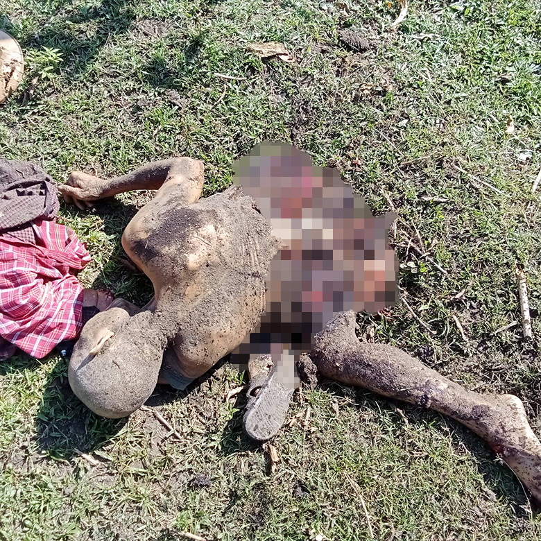 A KHRG field researcher received these photos from the second head of Kruh Tuh Township media group. The photos were taken on October 18th 2024 at A--- village, Myauk Kya Inn village tract, Kruh Tuh Township, Dooplaya District. The photos display U D---’s body after he was hit by mortar shells on October 18th 2024, while he was herding his cows, at A--- village. [Photos: KNU media group]