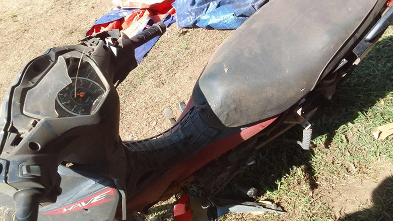 KHRG received these photos from a local villager on January 7th 2025. The two photos above show two villagers, named Saw K--- (34 years old) and Naw S--- (33 years old), who were injured by an SAC air strike that occurred on January 7th 2025, in P--- village, Paw Hkloh area, K’Ser Doh Township, Mergui-Tavoy District. The photo on the bottom left shows pieces of one of the bombs. The photo on the bottom right shows a villager’s motorbike that was damaged by the air strike. [Photos: Local villager]