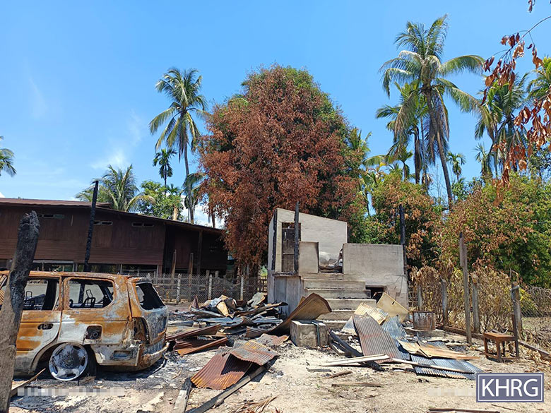 These two photos were taken on May 2024, in Aa--- village, Way Shah village tract, T’Nay Hsah Township, Hpa-an District. On March 17th 2024, SAC soldiers from IB #275 army camp, conducted shelling (120 mm) into Aa--- village and two mortar shells landed on and burned a house, a shop, and a car owned by Saw C---. These two photos show the house, shop, and car that were burned by the SAC shelling. [Photos: KHRG]