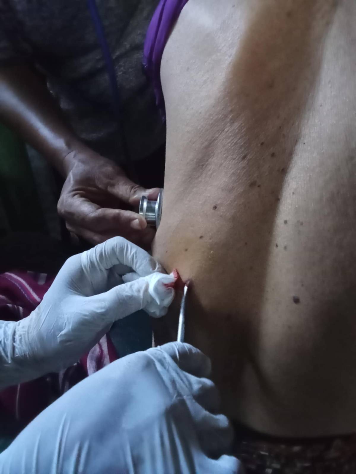 These photos were taken by local villager on November 26th 2024, in Ad--- clinic, Noh Hkwee village tract, Ta Kreh Township, Hpa-an District. On October 27th 2024, at around 3 pm, Burma Army soldiers shelled a mortar round into Ab--- village, Yaw Kuh village tract, T’Nay Hsah Township, and injured a 63-year-old woman named Daw A--- on her lower back. These photos show Daw A--- receiving treatment in Ad--- clinic. [Photos: Local villager]