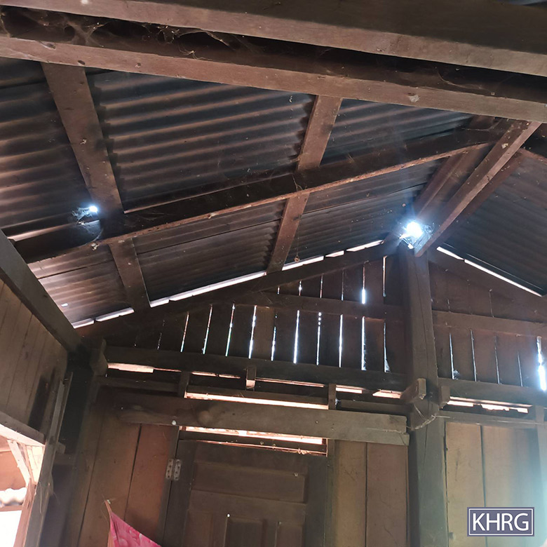 The photo on the right was received from a family member of the victim on April 4th 2025. It shows Naw A---’s dead body in her house in Aa--- village, Myauk Kya Inn village tract, Kruh Tuh Township, Dooplaya District. On April 1st 2025, SAC soldiers from MOC #12, based at the Hlaing Wa Artillery Unit camp in Kaw T’Ree Township, fired five 120 mm mortar rounds into Aa--- village area. A mortar shell landed in front of Naw A---’s house, killing her and damaging the house. The photo on the left was taken by a KHRG researcher in April 2025, in Aa--- village, Myauk Kya Inn village, and shows the roof of Naw A---’s house that was damaged by shrapnel from SAC mortar shelling on April 1st 2025. [Photos: KHRG/local villager].
