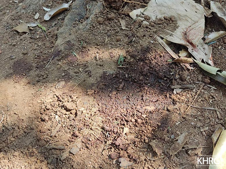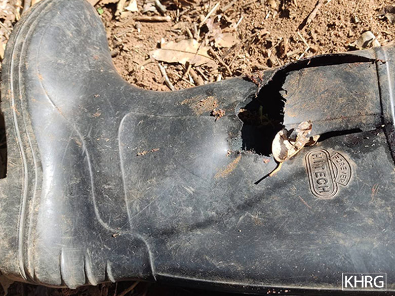 These photos were taken in November 2024 in a betel nut plantation near A--- village, Kaw Thay Der village tract, Htaw Ta Htoo Township, Taw Oo District. The left photo shows the rubber shoe that Saw C--- was wearing while working in the betel plantation. He was hit by the shrapnel of the mortar shell fired by the SAC on November 21st 2024. The explosion severed his leg and also caused a neck wound, leading to significant blood loss and ultimately causing his death. The right photo shows some blood of Saw C--- on the ground of the betel nut plantation. [Photos: KHRG]