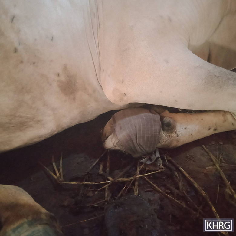 This photo was taken in January 2024 in Dj--- village, Moo special area, Moo Township, Kler Lwee Htoo District. On January 23rd 2025, SAC LIB #439, based in Shwe Wa army camp, conducted mortar shelling into Dj--- village. The mortar explosion destroyed villagers’ houses, killed one cow and injured one bull. This photo shows a bull owned by U Dk--- and Daw Dl---, injured in the leg. Villagers treated the injury in order to save the animal and protect their future livelihoods. [Photo: KHRG]