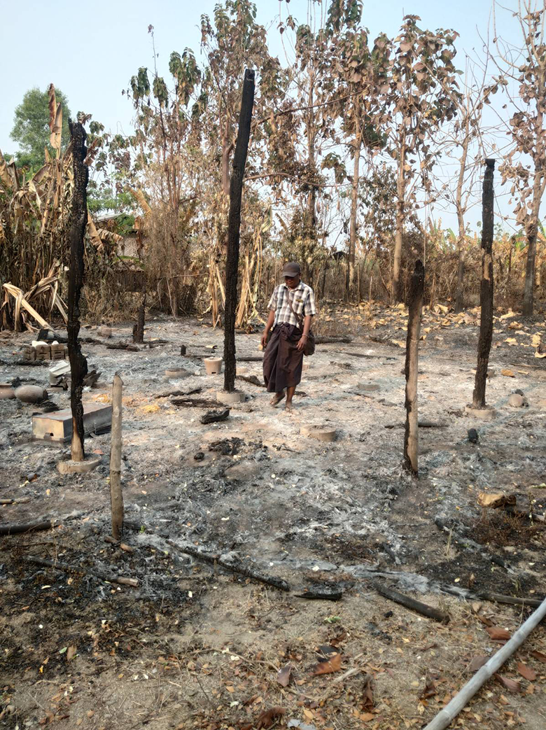 This photo was taken in January 2024 in D--- village, Day Loh Mu Nu village tract, Htaw Ta Htoo Township, Taw Oo District. On January 8th 2024, at around 6 pm, Karen National Liberation Army (KNLA)[8] forces combined with the People Defence Force (PDF)[9] attacked SAC Infantry Battalion (IB)[10] #39 army camp, based in Lay Maing (‘Four Miles’) area. On January 10th, SAC soldiers from IB #39 went into D--- village and burned down 17 villagers’ houses. The photo on the left shows one of the houses, completely destroyed. The owners of the burned houses are Kyaw[11] E---, Saw[12] F---, G---, H---, I---, J---, K---, Naw[13] L---, Naw M---, Saw N---, O---, P---, Saw Q---, Kyaw R---, Saw S---, Saw T---, and U---. [Photo: KHRG]