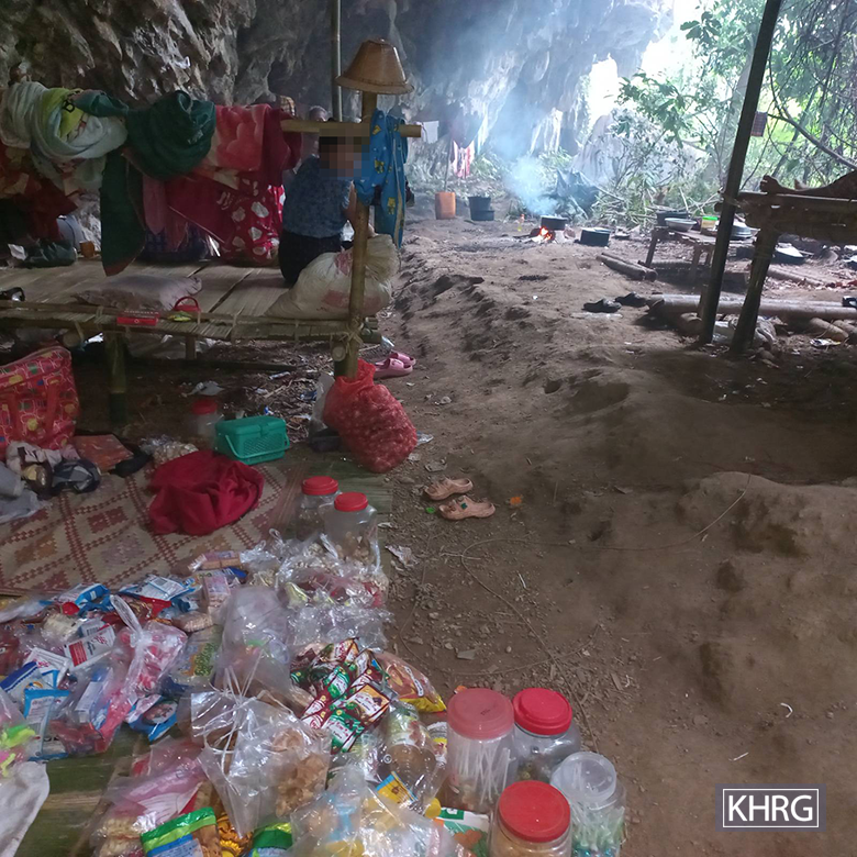 These two photo were taken in April 2024 in a cave where villagers were displaced in Noh Hsoo Neh village tract, Waw Ray Township, Dooplaya District. Villagers are displaced after an air strike was conducted by the SAC in Noh Ber Baw village tract, Waw Ray Township, on 12th March 2024. The photo on the left shows villagers who brought their store stock to the displacement site and continued running a small shop to support their livelihoods. The photo on the right shows villagers husking betel nuts, which they had brought to the displacement site to help meet part of their livelihood needs. [Photo: KHRG]