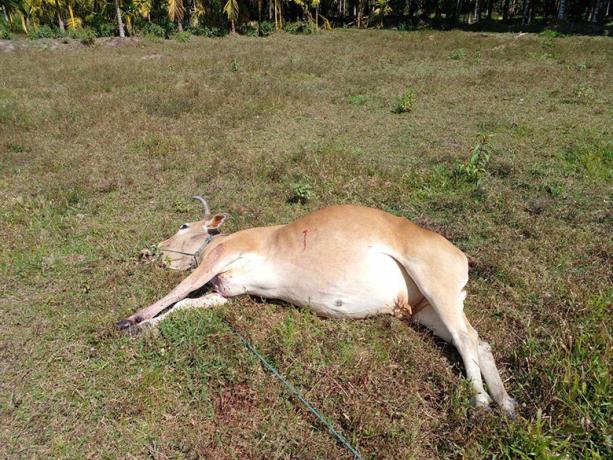 This photo was received on March 27th 2024, from Bf--- village, P’Law Area, Ler Mu Lah Township, Mergui-Tavoy District. On January 4th 2024, SAC soldiers from IB #285, based in P’Law Town, indiscriminately fired two 120 mm mortar rounds into Bf--- village. Some of the mortar rounds landed on villagers’ plantations and farms, resulting in the death of a cow (as shown in the picture) and damage to the plantations. [Photo: Local villager]