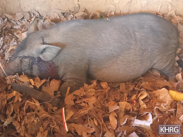 This photo was taken in March 2024 in Bg--- village, Meh Nyoo Hta village tract, Bu Tho Township, Mu Traw District. On March 25th 2024, an SAC aircraft dropped bombs onto Bg--- village. The resulting explosion damaged villagers’ properties and killed their livestock. The photo shows one of the two dead pigs, owned by a villager named U Bh---. [Photo: KHRG]