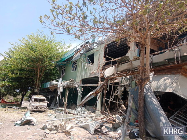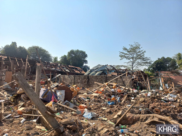 This photo was taken in March 2024 in Myo Thit Town, located between Kaw T’Ree Township, in Dooplaya District, and T’Nay Hsah Township, in Hpa-an District. The photo shows one of the villagers’ houses destroyed by an SAC air strike, on March 5th 2024, in Myo Thit Town, during fighting between the SAC against combined forces of the KNLA and PDF. [Photo: KHRG]