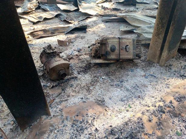 KHRG received this photo on December 22nd 2023. It was taken in By--- village, Aaw Poo area, Ler Mu Lah Township, Mergui-Tavoy District. Regardless of whether fighting occurred or not, SAC forces in Aaw Poo area frequently conducted indiscriminate shelling into civilian areas, forcing villagers to displace for their safety. Some villagers relocated to displacement sites, while others moved to safer areas near farms and plantations. On December 21st 2023, SAC soldiers from IB #285 fired about 80 mortar rounds into By--- village and surrounding farmlands. As a result of the heavy shelling, two villagers’ houses and a barn were burned down, along with all their possessions, and one villager sustained a head injury. The photo shows a villager’s multifunctional machine burned during the incident. [Photo: Local villager]