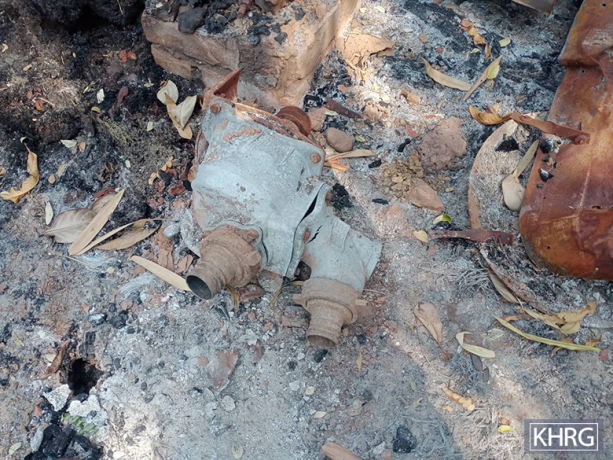 This photo was taken in March 2025 in Bt--- village, Mway Twin village tract, Moo Township, Kler Lwee Htoo District. On March 11th 2024, SAC LIB #599, known as Ton Taw Battalion, set fire to the bushes near their army camp to clear the area. The fire spread to Bt--- and Bu--- villages, where 42 villagers’ houses burned down. The fire reached the village while villagers were displaced to another area due to earlier shelling that had caused deaths and injuries. When villagers at the displacement site saw smoke rising from their village, they tried to return to extinguish the flames and protect their houses and properties. However, they were unable to save all of them. The photo on the left shows a burned tractor, while the photo on the right shows a burned farming machine engine used for livelihood activities. Many farming machines and tools were lost in the fire. [Photos: KHRG]