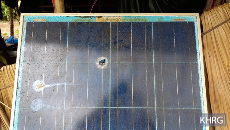 This photo was taken in August 2024 in Bv--- village, Aee Heh village tract, Hpa-an Township, Doo Tha Htoo District. On August 22nd 2024, SAC soldiers from MOC #8 (based in P’Nweh Kla army camp, Maw Lay village tract, Bilin Township) indiscriminately fired two shells into Bv--- village. The first 120 mm shell landed on a road near a house owned by Saw Bw---, damaging its roof and wall. The second mortar shell landed near a hut owned by Saw Bx--- and destroyed a solar panel, seen in the picture. [Photo: KHRG]