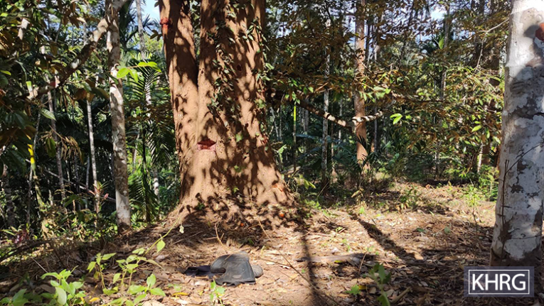 This photo was taken in September 2024 near Bb--- village, Taw Tee village tract, Waw Ray Township, Dooplaya District. On September 21st 2024, the SAC conducted shelling onto civilian areas in Taw Tee village tract, including villages, plantations, and farmland. This photo shows rubber trees from a villager destroyed by a shell fired by the SAC. The explosion also destroyed villagers’ houses, other plantations, and injured a villager named Bc---. [Photo: Local villager]