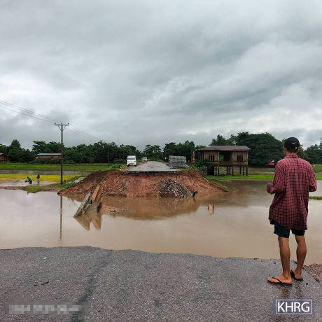 This photo was taken in July 2024 near Du--- village, Kyet Tu Yway village tract, Ta Kreh Township, Hpa-an District. The photo shows a bridge on a road near Du--- village that destroyed by flooding between July 22nd and 26th 2024. [Photo: KHRG]