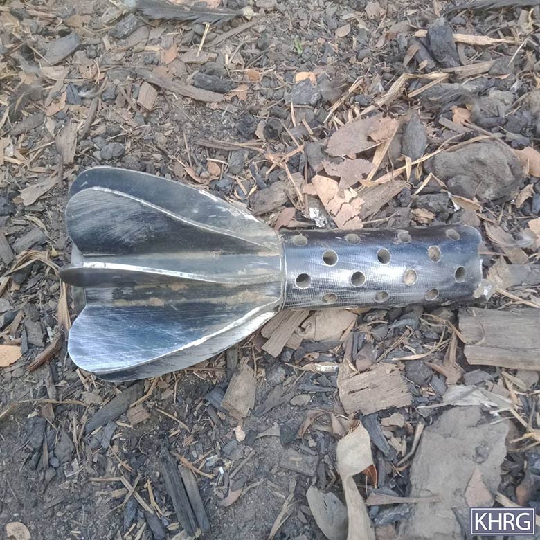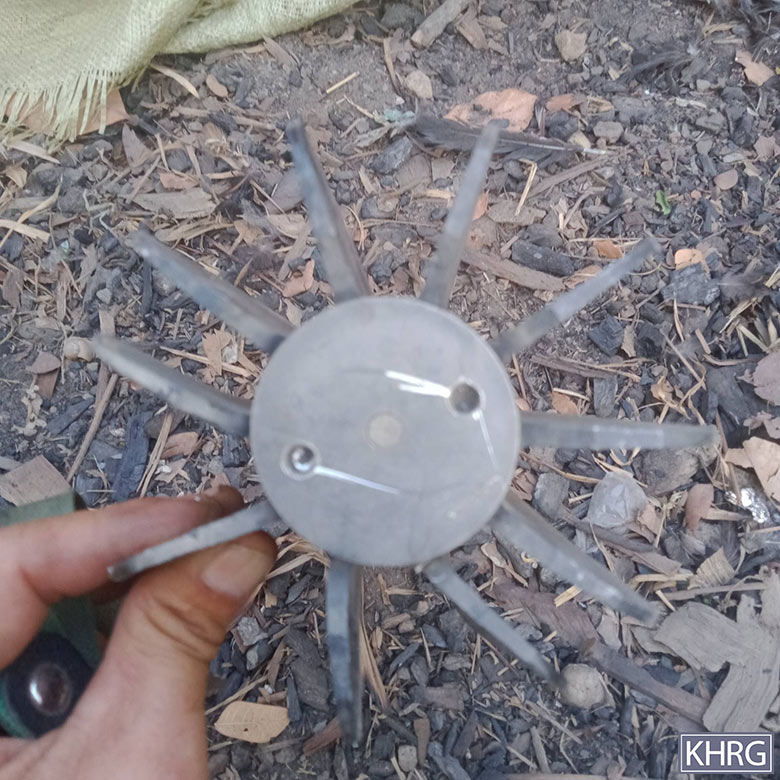 These photos were taken by a KHRG researcher in March 2025, in Zy--- village, Kyun Pin Hseik village tract, Moo Township, Kler Lwee Htoo District. The first four photos show the damage to two buildings caused by the March 7th 2025 shelling by the SAC’s LIB #599 into the village. The other two photos show the tail pieces of the mortar shells that the SAC fired. [Photos: KHRG]