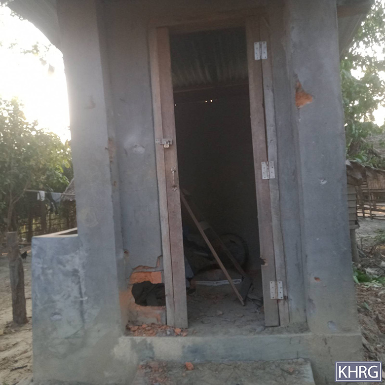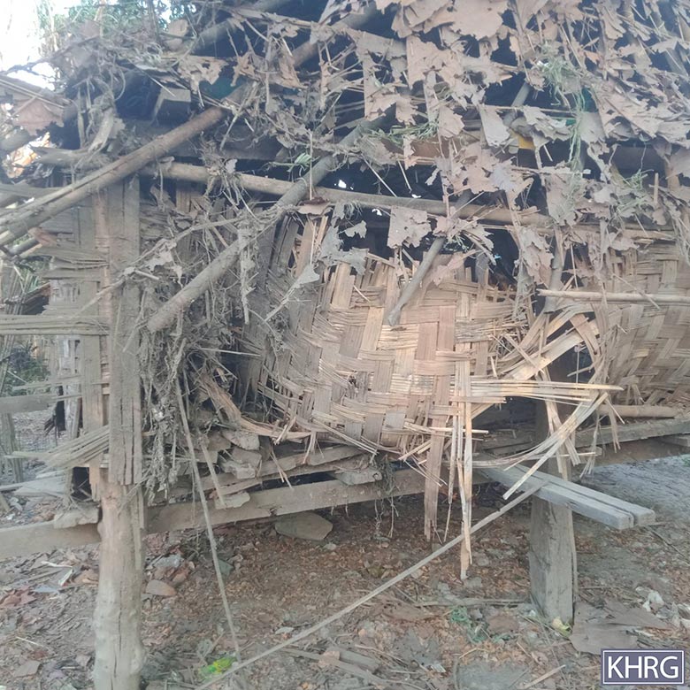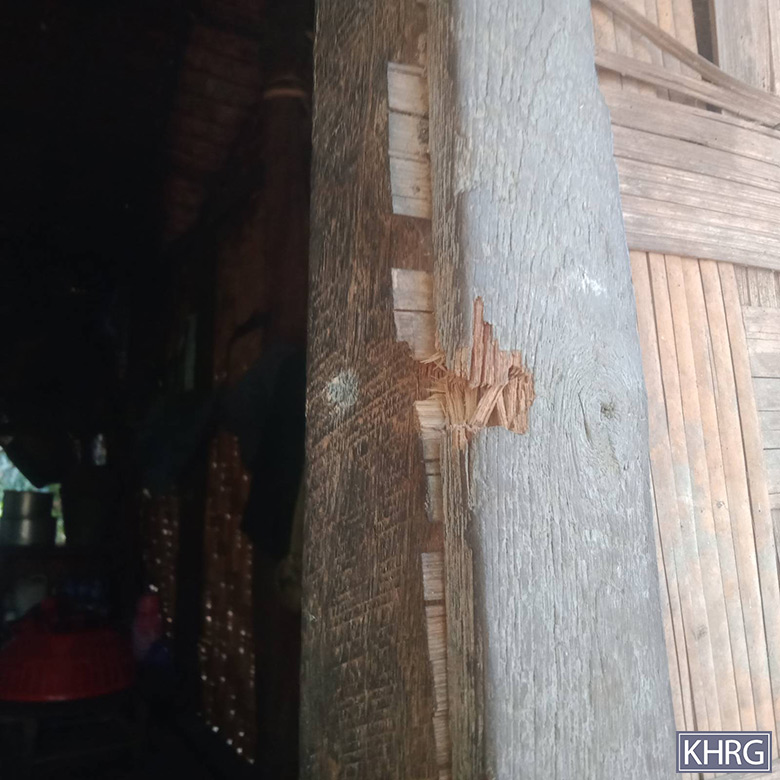 These five photos were taken by a KHRG researcher in March 2025, in Zy--- village, Kyun Pin Hseik village tract, Moo Township, Kler Lwee Htoo District. The photos show the damage caused by the shells fired into Zy--- village on March 7th 2025, by the SAC’s LIB #599, who are based in To Taw village. [Photos: KHRG]