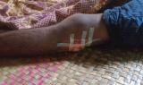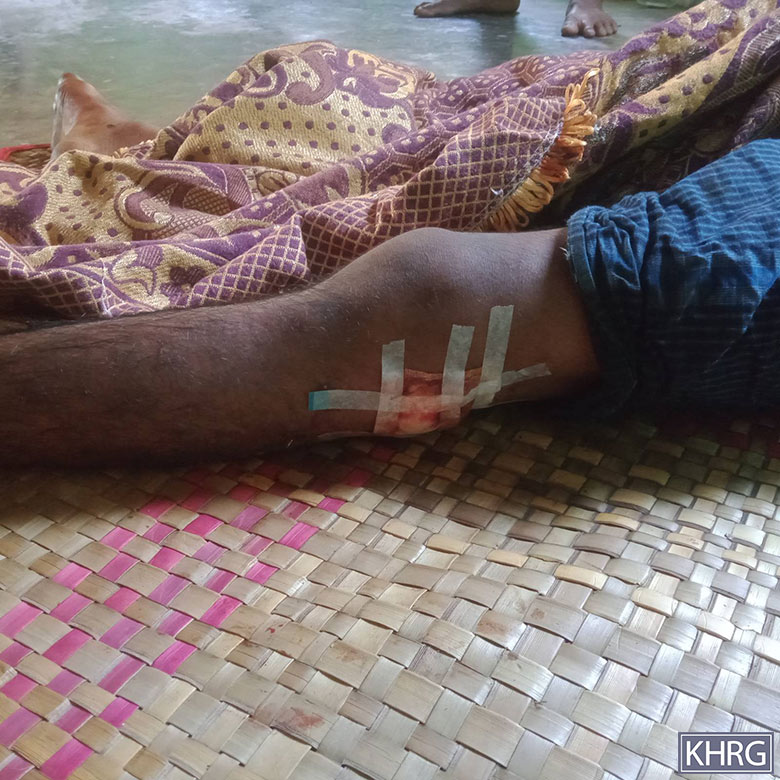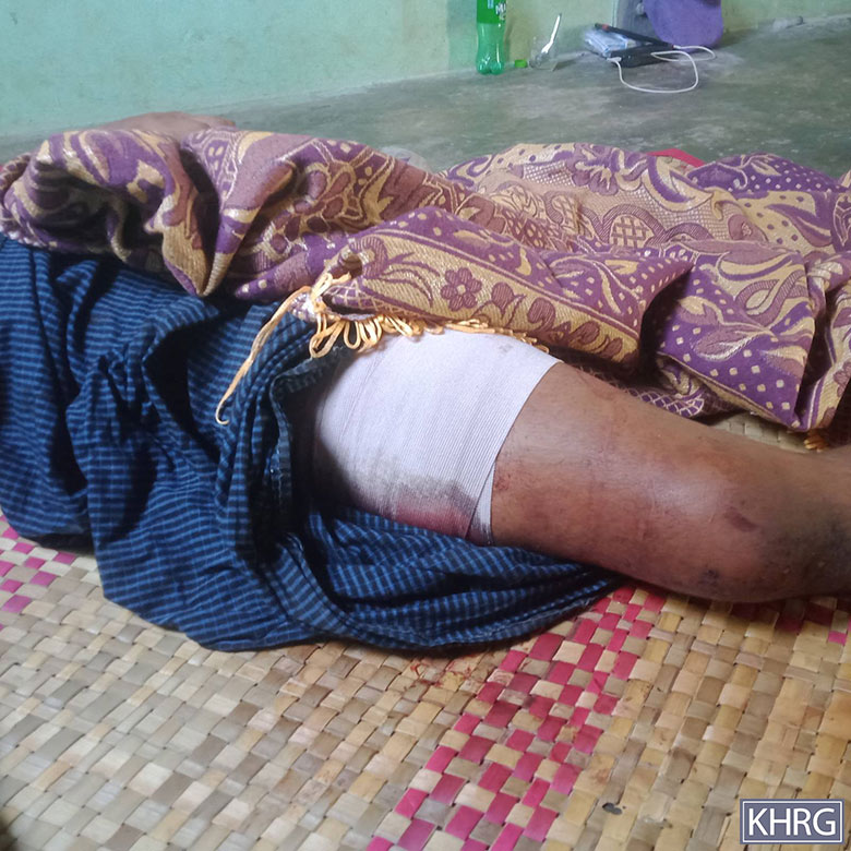 These four photos were taken in March 2025 by a KHRG researcher in a temporary hospital located in Yv--- village, P’Nah Wah Plaw village tract, Moo Township, Kler Lwee Htoo District. The photos show the injuries caused by one of two 120 mm mortar shells fired by the SAC’s LIB #599 into Zy--- village, Kyun Pin Hseik village tract, Moo Township. The two photos on the top show 58-year-old U T---, who was injured on the side of his right knee and on his right buttock by shrapnel from the shell explosion at his house. The two photos below show the 24-year-old son of U T---, named Maung X---, who was injured on his right thigh. Shrapnel from the SAC shelling broke his right thigh and injured him below his right knee. [Photos: KHRG]