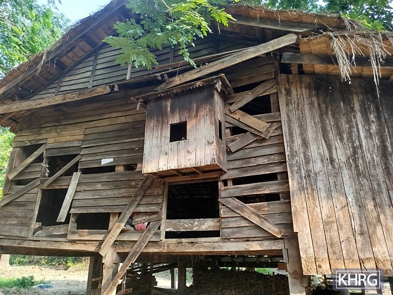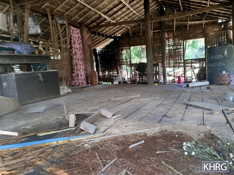 On that day, Ko A--- and [his wife] Ma[9] B--- were inside their house, located close to the high school. [In an interview with KHRG,] Ma B--- explained: “Ko A--- was sleeping inside the kitchen and I was fetching water up and down after I had finished cooking. When the aircraft came, I was aware that the sounds of the aircraft were different from before [when it was just passing by]. The sounds were not as loud as other aircraft. The sounds were similar to conducting air reconnaissance over the village. I told Ko A--- to come downstairs [of the stilted house], because I did not feel that safe. The sounds that the aircraft made were like conducting air reconnaissance over our village. When I was speaking, he was still sleeping. As soon as I finished speaking, the aircraft came closer to the ground. When he [Ko A---] came down, it was too late for him. He got hit. He was in the kitchen. But for me, I was not injured. Because when I heard the sounds [of the aircraft], I rushed [to take cover] under the house. He rushed to come down too, but it was too late for him.” He was not injured severely, thus he recovered rapidly. He was treated [by a health worker from the Karen Department of Health and Welfare (KDHW)[10]] in a PDF [People’s Defence Force[11]] medical clinic located in the village. He did not have to pay for the treatment.