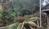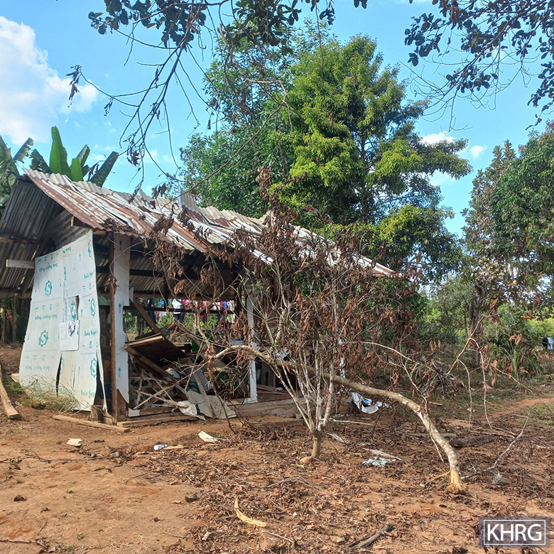 These four photos were taken by a KHRG researcher in January 2026 at Aa--- village, K’Maw Thway village tract, Ler Doh Soe Township, Mergui-Tavoy District. On January 10th 2026, between 1 to 2 pm, a Burma Army aircraft dropped two 250-pound bombs onto Aa--- village, damaging a clinic, villagers’ plantation fields, and buildings of a KNU township office compound. A two-year-old girl was killed, and nine other people (including another child) were injured. The photo on the top left shows that glass windows of the clinic in Aa--- village shattered into pieces. The photo on the top right illustrates damaged plantations. The photos on the bottom right and left show buildings of a KNU township office compound that were hit by the air strike. [Photos: KHRG]
