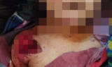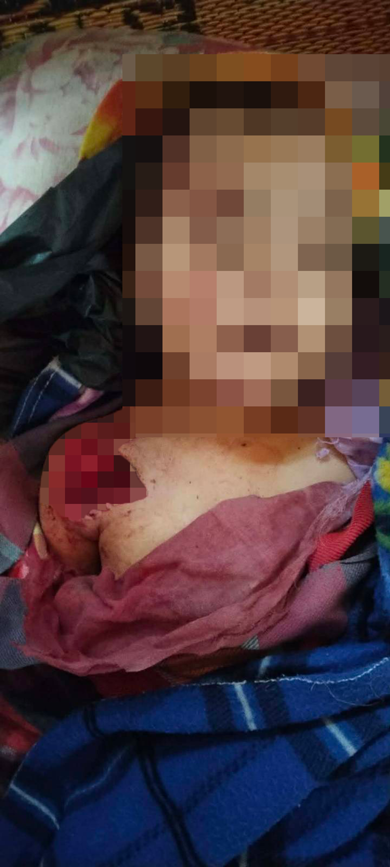KHRG received these photos in January 2026 from a villager in Aa--- village, K’Maw Thway village tract, Ler Doh Soe Township, Mergui-Tavoy District. On January 10th 2026, between 1 and 2 pm, an aircraft of the Burma Army dropped two 250-pound bombs into Aa--- village, causing one death, injury to nine villagers, and property damage. The photo at the top is an image of the injuries sustained by two-year-old Ma B--- due to the air strike. The photo at the bottom shows the body of Naw A---, who was injured on her right shoulder and died due to the air strike. [Photos: Local villager]