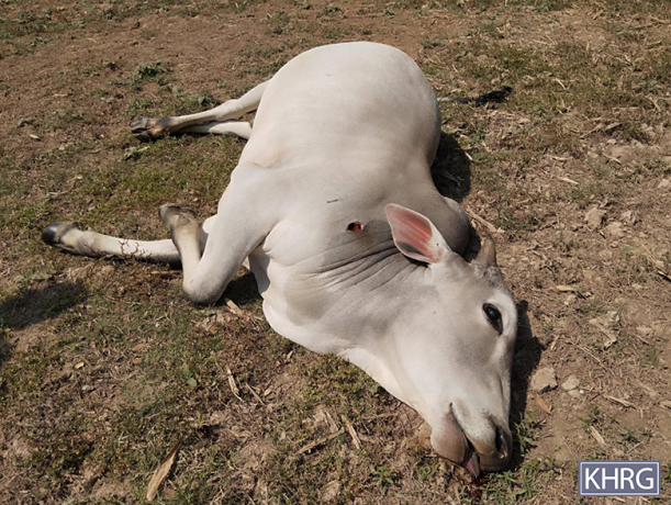 This photo was taken in February 2025 in Ss--- village, Kway Kon village tract, Hsaw Htee Township, Kler Lwee Htoo District. On February 19th, 2025, at 12:37 pm, an SAC fighter jet carried out an air strike in Ss--- village, injuring an 18-year-old villager named Naw[27] I---. She sustained an injury to her left leg. In addition, the air strike destroyed two houses, killed two cows, and injured three cows owned by local villagers. The photo shows a cow, killed by the SAC air strike. [Photo: KHRG]