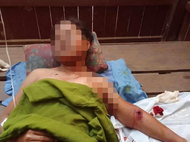 KHRG received this photo on January 29th 2025, from a local leader. On January 21st 2025, SAC Light Infantry Battalion (LIB)[23] #20, based in Yay Kyi Khayung village, Inn Wine village tract, Hsaw Htee Township, Kler Lwee Htoo District conducted a drone strike onto Oo--- village and Pp--- village in Pyin Yay village tract, Hsaw Htee Township. One of the bombs from the drone was dropped in a monastery in Pp--- village. As a result, a monk was killed, and another monk was injured on his left thigh. Another bomb from the drone was dropped in front of a villager’s house in Oo--- village, owned by Ko[24] F---. Ko F--- was injured on his arms by the bomb’s shrapnel. According to local villagers, People’s Defence Force (PDF)[25] soldiers sometimes travelled through the two villages, so the villagers believe that is why the SAC targeted and attacked these two villages. The photo shows the monk, injured by the SAC drone attack. [Photo: Local leader]