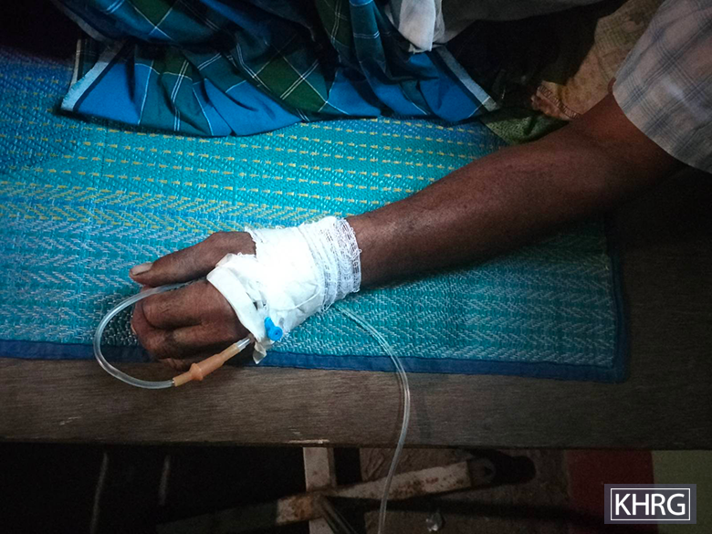 U A---, who lives in Aa--- village, has four children. Three of his children are married and only his youngest son is single. His youngest son works in Thailand; thus, he and his wife live alone together at home. Due to high prices and livelihood difficulties, U A--- works as a toll collector at a tollgate run by the KNU, located in Aa--- village. The job pays 15,000 kyat (7.14 USD)[8] per day and it helps alleviate his livelihood difficulties. He has been working at the same gate for over nine months. [While U A--- was able to recover in the hospital and return home, his current livelihood situation is unknown to KHRG.]