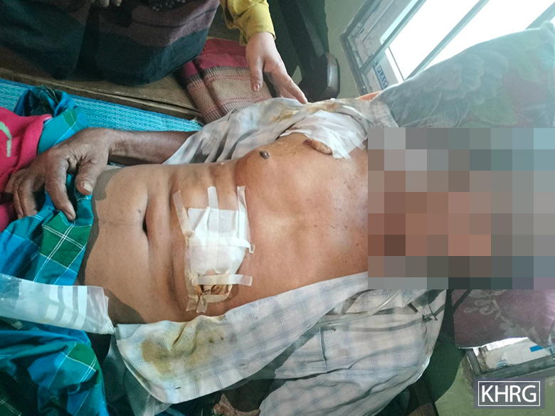 On March 15th 2026, the Burma Army dropped three bombs from a drone and one of the bombs landed and exploded at a tollgate administered by the Karen National Union (KNU), in Aa--- village, Zayat Gyi Taung Chan village tract, Htaw Ta Htoo (Htantabin) Township, Taw Oo (Toungoo) District. Shrapnel from the explosion severely injured U A---, 65 years old. His colleague, U B---, sustained minor injuries. The photo on the left shows U A--- receiving treatment, and the photo on the right shows the injuries to his shoulder and abdomen. U A--- received treatment at a Karen Department of Health and Welfare (KDHW) hospital in Ad--- village, Peh Htee village tract, Htaw Ta Htoo Township. [Photos: KHRG]