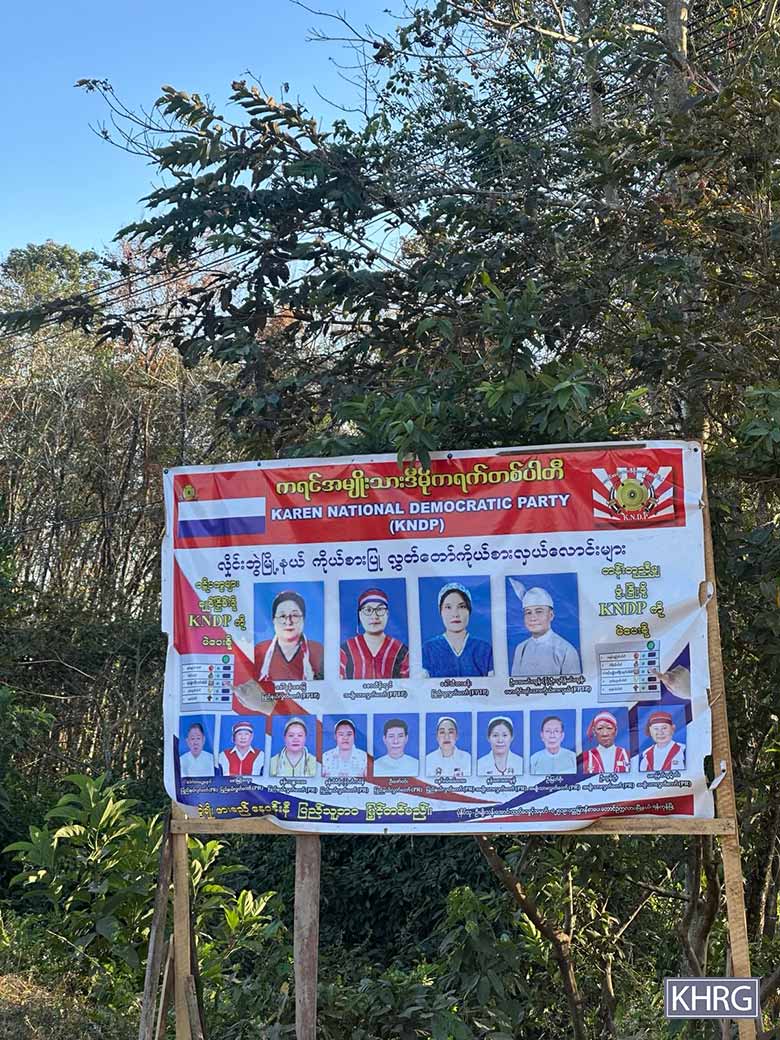 This photo was taken in December 2025, in the area near Ta Kreh Town, Ta Kreh Township, Hpa-an District. This photo shows a signpost campaign of three parties beside a vehicle road: Karen National Democratic Party (KNDP), Plone-Sgaw Democratic Party (PSDP), and Union Solidarity and Development Party (USDP). [Photo: KHRG]