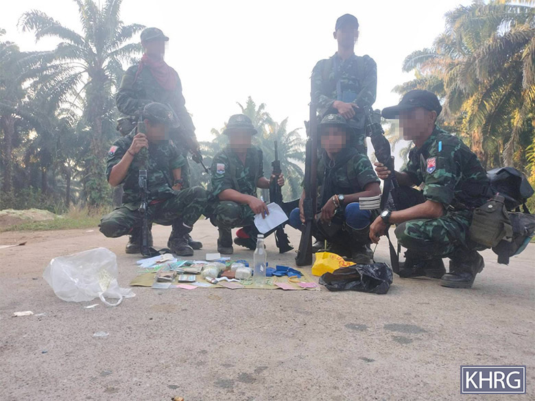 ဤဓာတ်ပုံကို ၂၀၂၅ ခုနှစ်၊ ဇန်နဝါရီလအတွင်း ဘိတ်-ထားဝယ် ခရိုင်၊ လယ်ကဆောမြို့နယ်၊ စတိန်ကျေးရွာအုပ်စု၊ ညအ--- ကျေး ရွာအနီးရှိ ကရင်အမျိုးသားလွတ်မြောက်ရေးတပ်မတော် (KNLA) စစ်ဆေးရေးဂိတ်တစ်ခုတွင် ရိုက်ယူခဲ့သည်။ ပုံတွင် KNLA တပ်ရင်း (၂၀၃) လက်အောက်ခံ တပ်ခွဲ (၄)မှ စစ်သားများသည် ညအ--- ကျေးရွာမှ ဦးမ--- ၏အိမ်တွင် မြင်းဆေးအပြား (၁၂၅၂၀) ပြားကို ဖမ်းဆီးရမိသည့်အခြေအနေကို ဖော်ပြထားသည်။ ဦးမ--- သည် မြန်မာစစ်အစိုးရ (SAC) အာဏာပိုင်များလက်အောက်တွင် တာဝန် ထမ်းဆောင်သည့်ကျေးရွာအုပ်ချုပ်ရေးမှူးတစ်ဦးဖြစ်သည်။ အဆို ပါမြင်းဆေးဖမ်းဆီးရမိသည့်အချိန်တွင် ဦးမ---သည် လှေတစ်စီး ဖြင့် ထွက်ပြေးလွတ်မြောက်ခဲ့သည်။ (ဓာတ်ပုံ - KHRG)