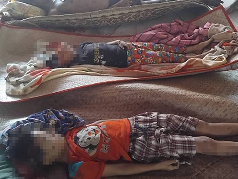 အထက်ပါဓာတ်ပုံများကို KNU အာဏာပိုင်တစ်ဦးထံမှ လက်ခံရရှိခဲ့ပါသည်။ ဓာတ်ပုံများကို ကက---ကျေးရွာတွင် ရိုက်ယူခဲ့ခြင်းဖြစ်သည်။ လက်ဝဲပုံတွင် SAC ၏လေကြောင်းတိုက်ခိုက်မှုတွင် ဗုံးစထိမှန်၍သေဆုံးသွားသောကျောင်းသားများကိုဖော်ပြထားပါသည်။ လက်ယာပုံတွင် သေဆုံးသွားသည့်ကျောင်းသားများ၏အလောင်းကို ဖျာဖြင့်လိပ်၍ မြေပြင်တွင်ချထားသောအခြေအနေကိုဖော်ပြထားပါသည်။ ၂၀၂၅ ခုနှစ်၊ ဇွန်လ ၉ ရက်နေ့တွင် SAC သည် ကက---ကျေးရွာတွင်းသို့ လေကြောင်းတိုက်ခိုက်မှုပြုလုပ်ခဲ့ပါသည်။ (ဓာတ်ပုံ- KNU အာဏာပိုင်တစ်ဦး)