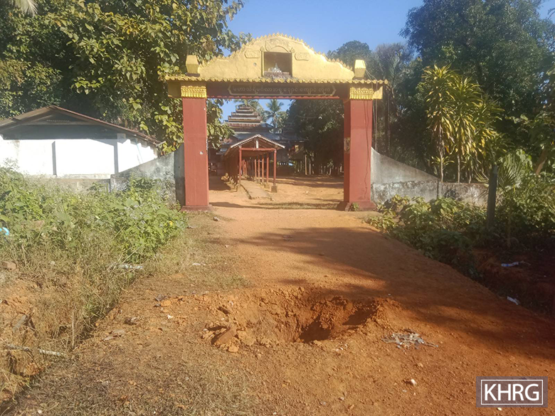 These photos were taken in January 2025, at Am--- village, Ah Su Chaung village tract, Bilin Township. On January 17th 2025, the SAC based at the Meh Pree army camp fired a 120 mm shell at around 7:31 pm. The shell landed in front of a monastery, Am--- village, causing damage to buildings on the monastery grounds and a nearby house. The photo on the top left shows the shell crater in front of the monastery gate. The photo on the bottom left shows a well building which was damaged by the shell, and the top right photo shows the spirit house which was damaged by the shell. [Photos: KHRG]