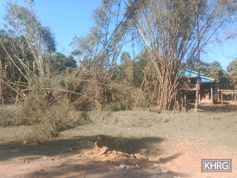 These photos were taken in January 2025 at As--- village, Meh Pree village tract, Bilin Township, Doo Tha Htoo District. On January 17th 2025, at 8 pm a jet fighter dropped a bomb on As--- village’s road and damaged a villager’s house. The photo on the left shows the house damaged by the bomb and the photo on the right shows the bomb crater. The attack followed clashes between SAC and KNLA troops outside Bc--- village, Meh Pree village tract, as well as SAC strafing, shelling, and bombing of villages near As--- earlier in the day. [Photos: KHRG]