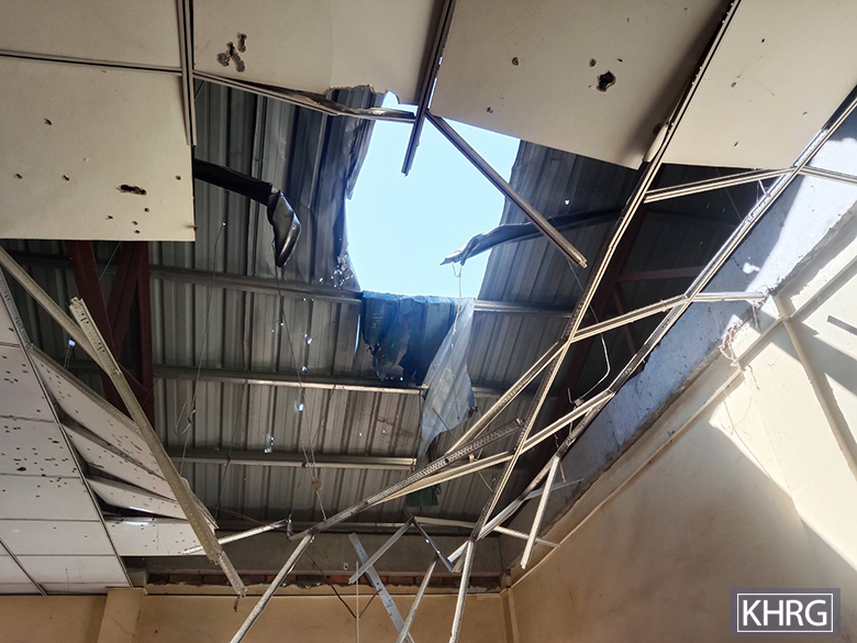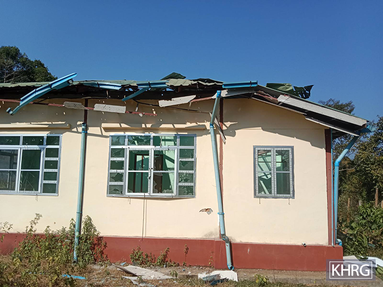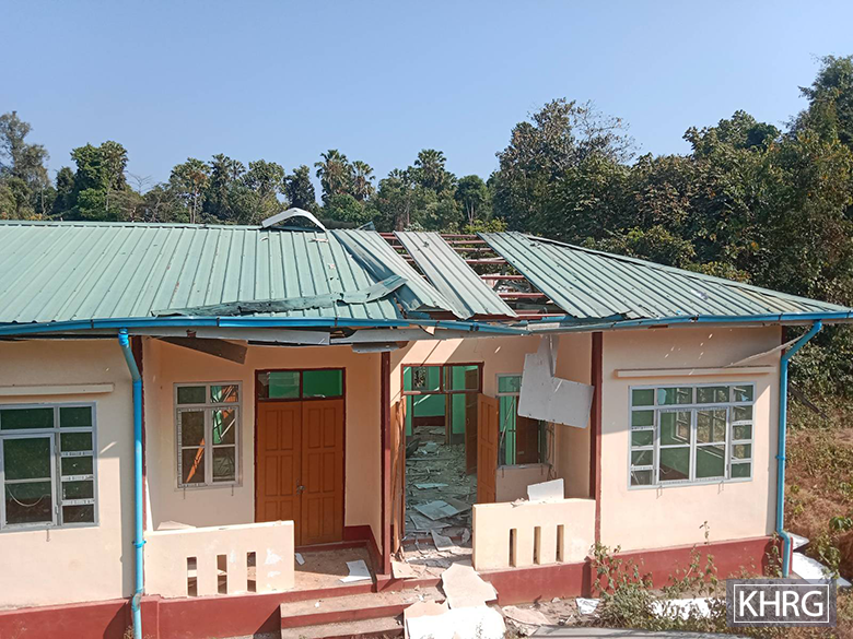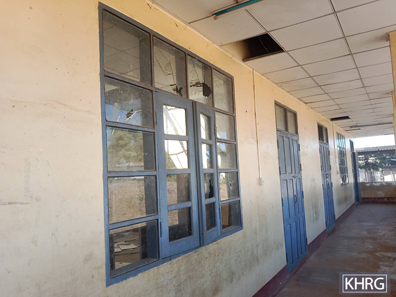 These photos were taken in January 2025 at Bf--- village, Min Saw village tract, Bilin Township, Doo Tha Htoo District. The photos show the damage to a middle school caused by an SAC drone strike on January 16th 2025 at Bf--- village. The photo on the left displays the damaged metal roof and ceiling of the school. The photo on the right displays the shattered glass windows and damage to the ceiling of the school. [Photo: KHRG]
